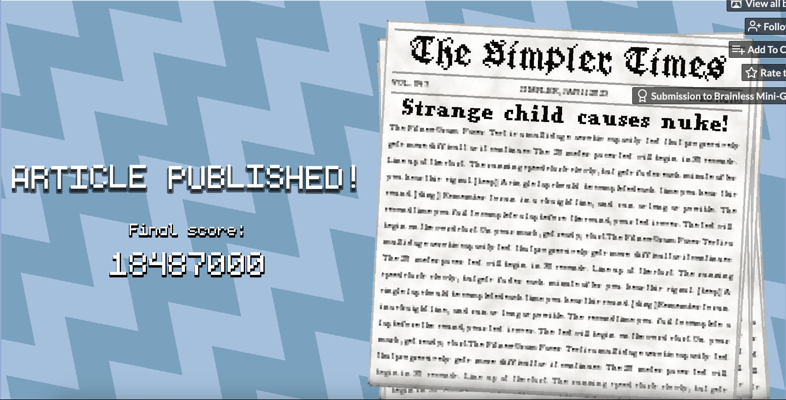 Cute little game. I like it. I don't know if you are planning on updating it, but I think a retry button after publishing the article would be great. Thank you for creating games and videos. :)